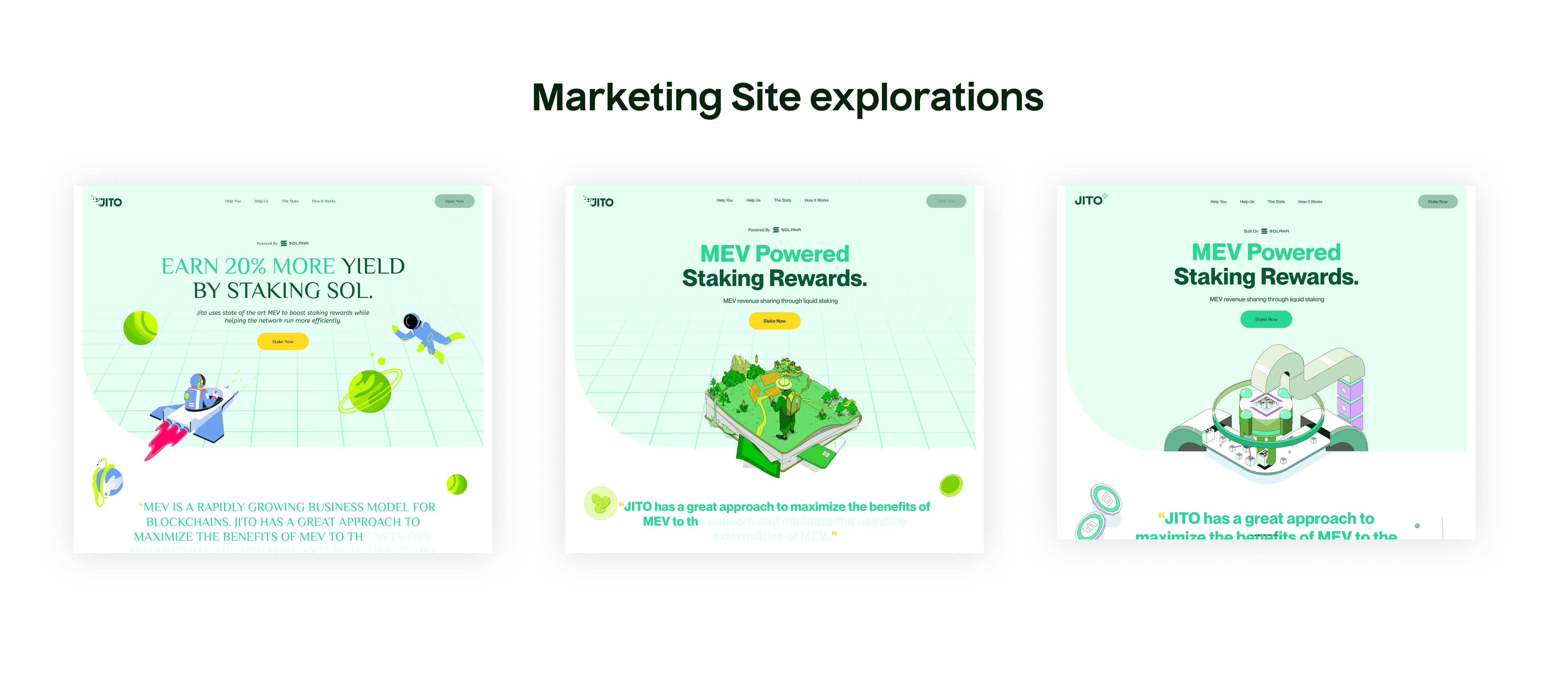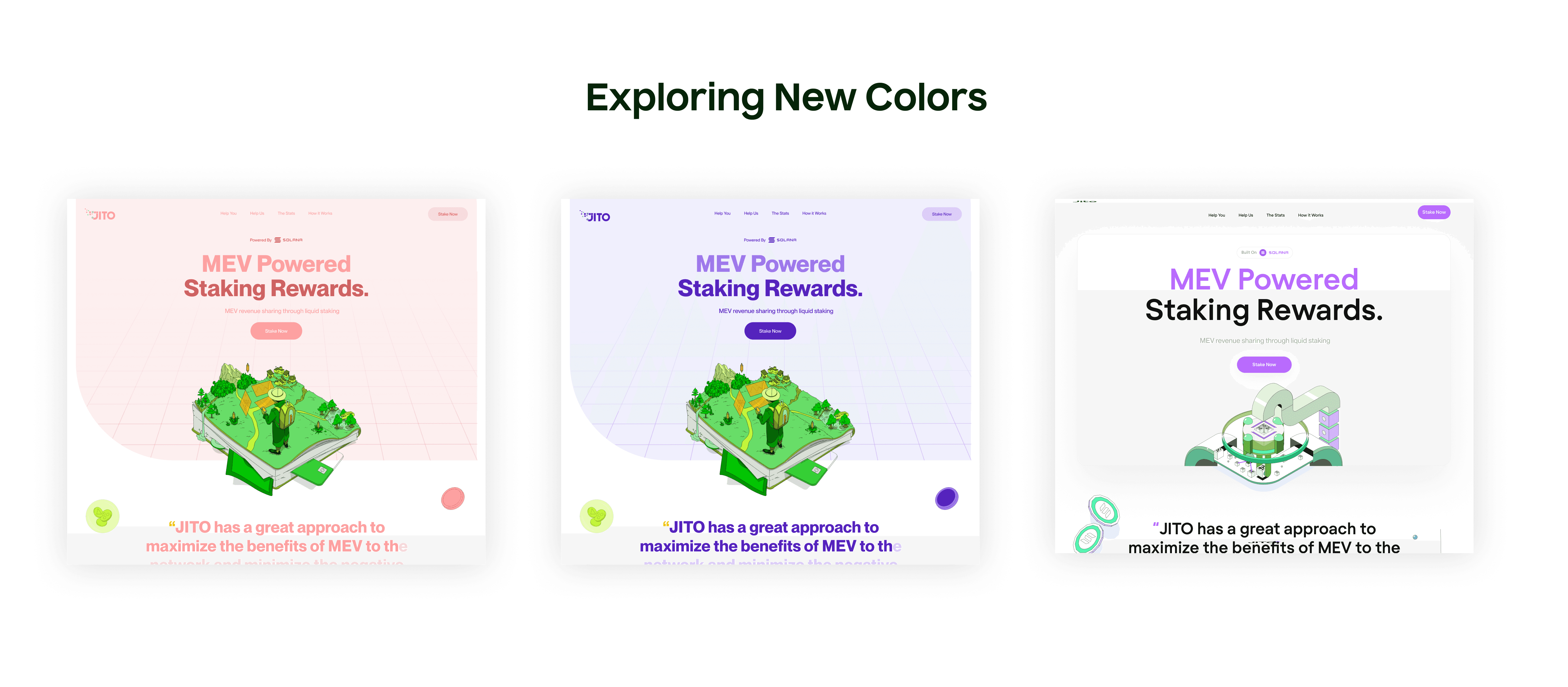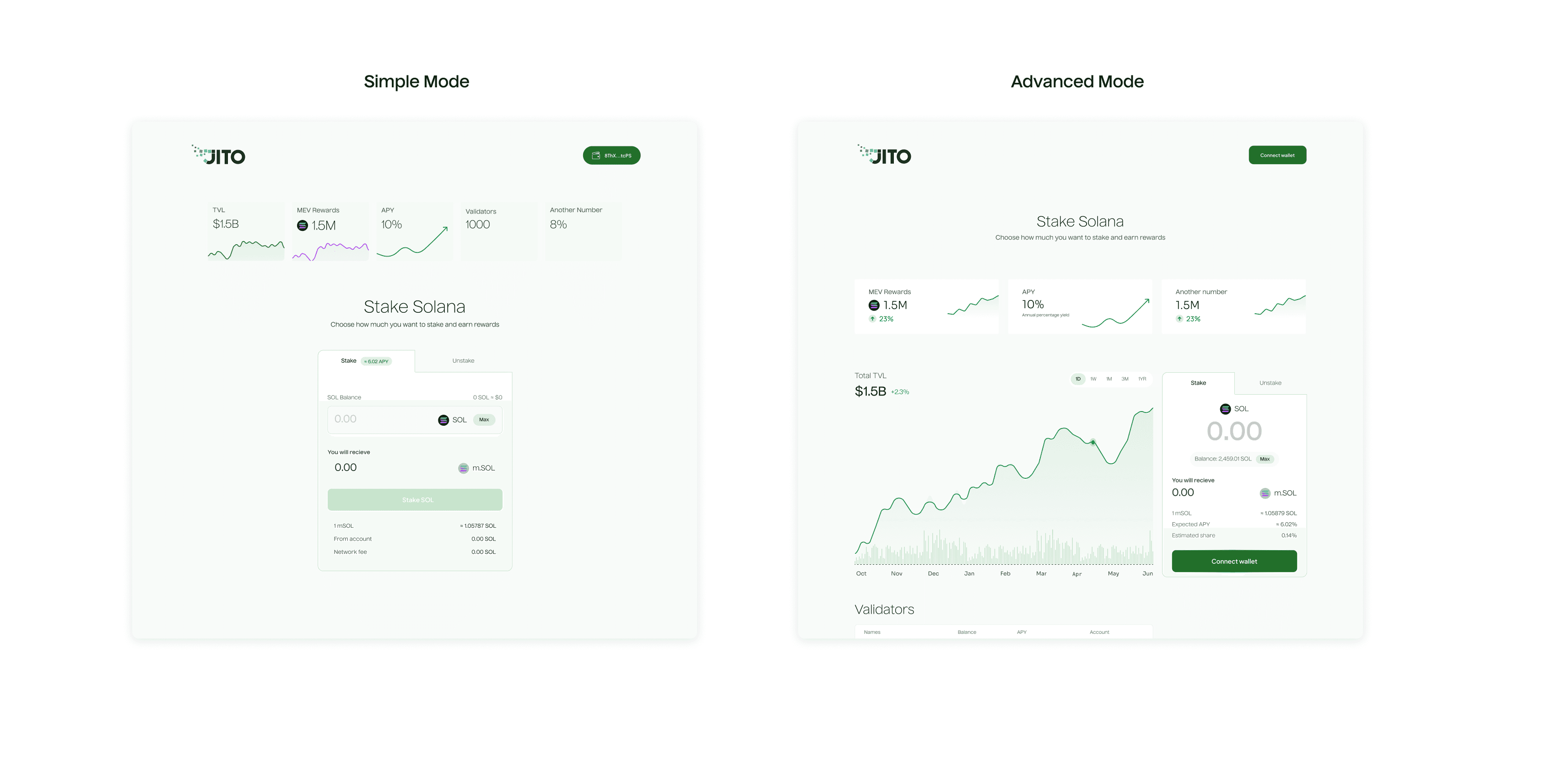 During the design process for the Jito Staking Platform, the client expressed a strong desire to use the color green in their design. This was partly because green is part of Solana's color scheme, but also because they were interested in learning from what other successful platforms like Marinande were doing. After exploring different design options for three days, we were able to create Version 1, which incorporated the client's desired use of green as well as other design elements that we felt would best meet the needs of the platform's users.