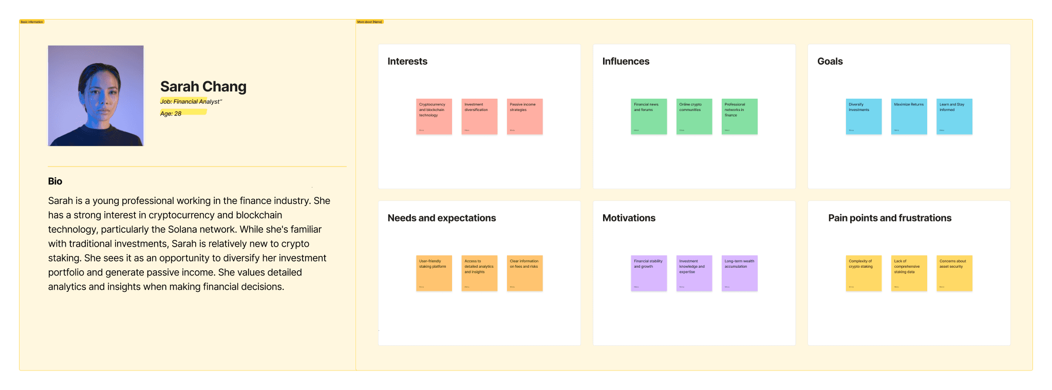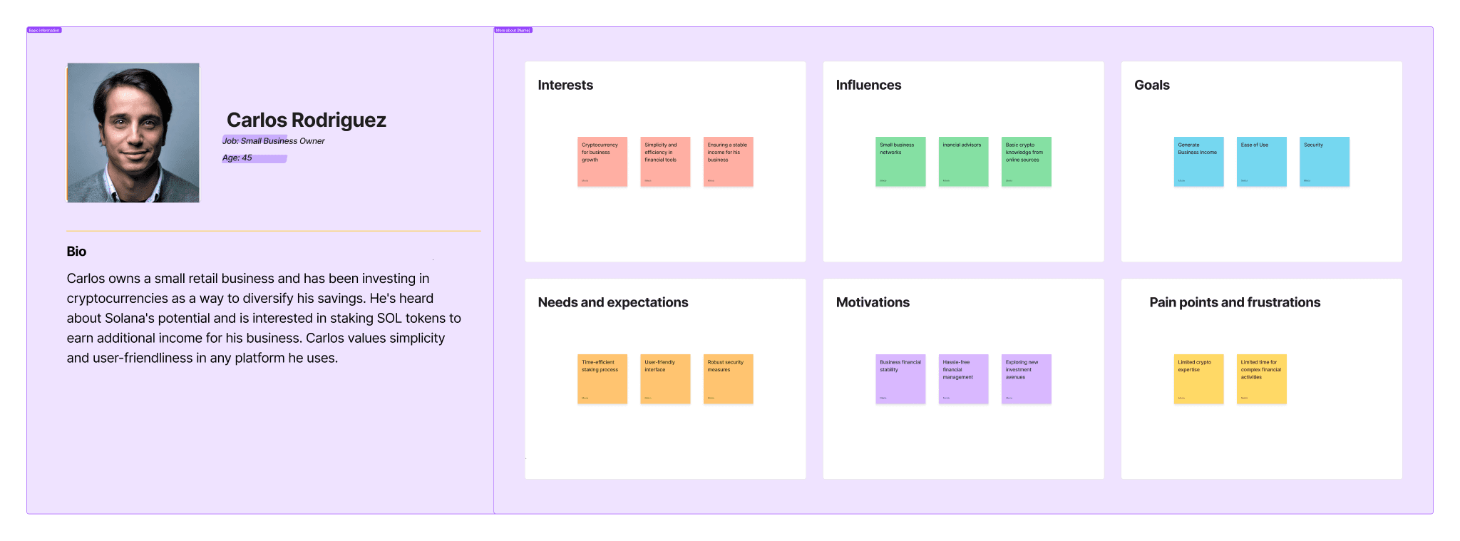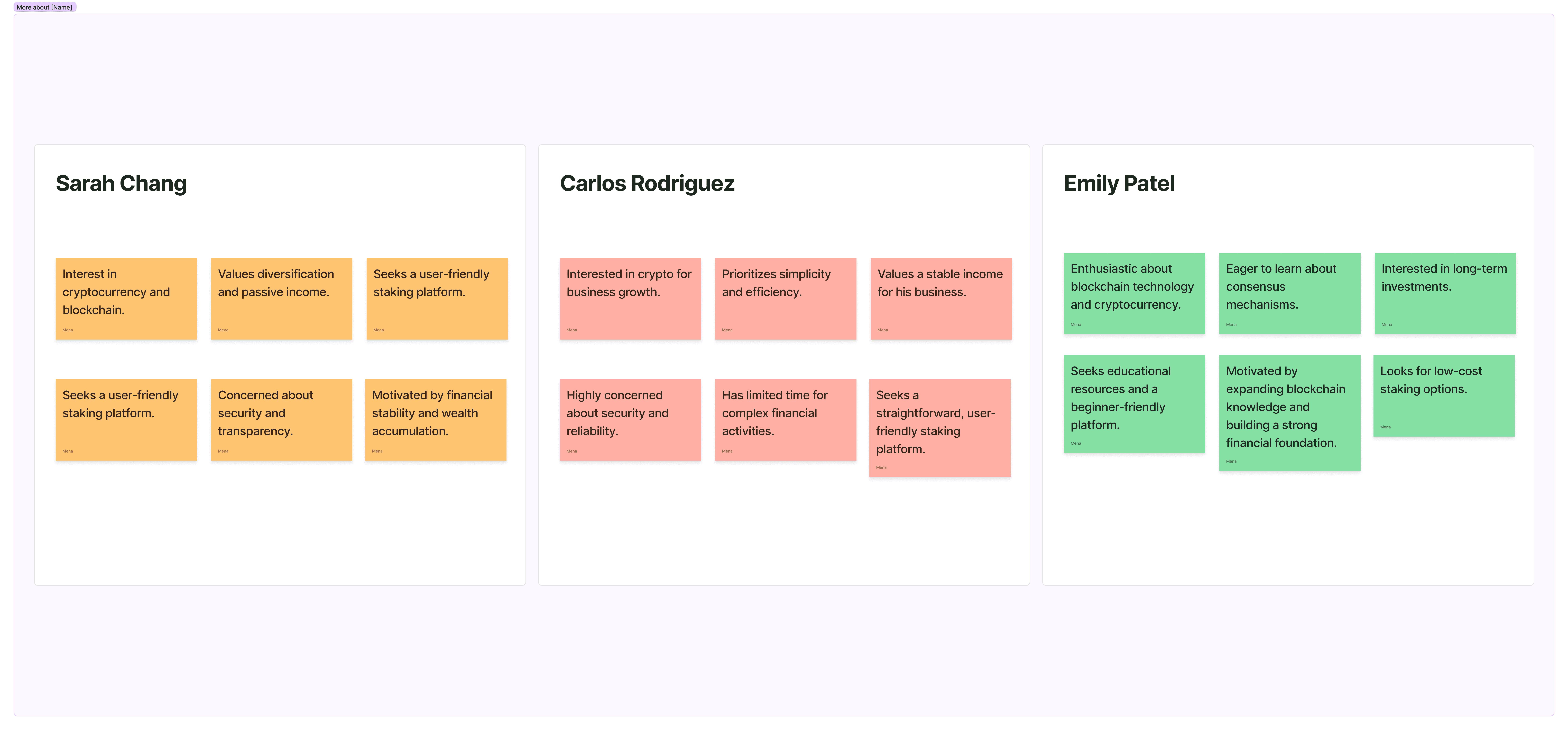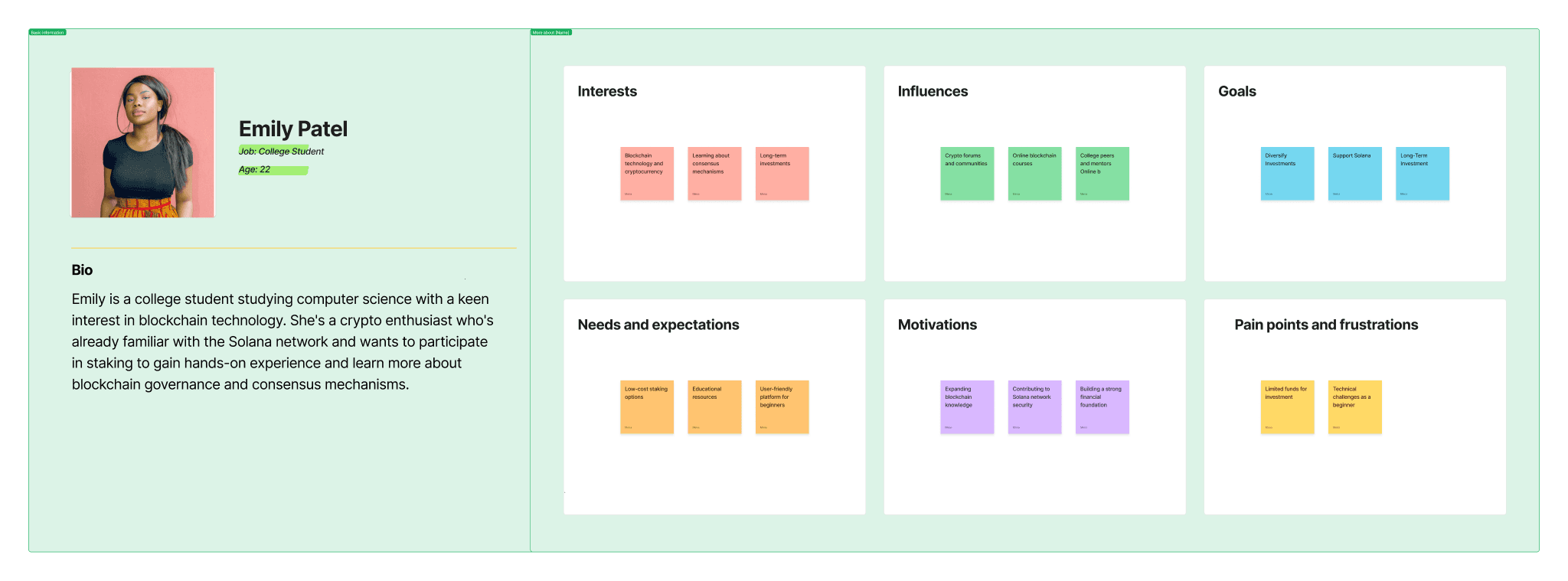 The user insights provided by the three personas show that potential users have a variety of preferences and priorities. Sarah, a financial analyst, values detailed analytics and is looking for a staking platform that is easy to use, so she can diversify and maximize her investments. Carlos, a small business owner, wants simplicity and efficiency to supplement his business income, and he also emphasizes the importance of security. Emily, a college student, is eager to learn and wants a beginner-friendly platform with low-cost options. She's driven by her desire to expand her knowledge. These insights highlight the need for a Solana staking platform to have both a straightforward, user-friendly interface and advanced features to accommodate a wide range of users with their unique goals.