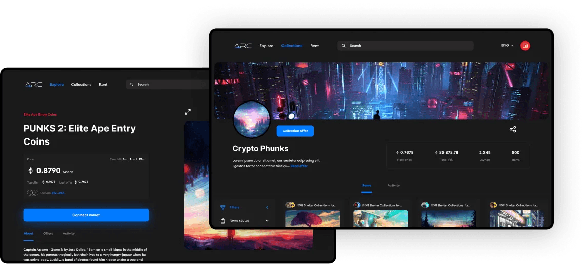 I came into Arc as the only designer on the project to handle the research, brainstorming with the CEO, who was the major visionary of the project. I took those ideas, improved on them, and created high-fidelity mockups that would be tested and implemented. I was shortly joined by another designer who would work directly under me to coordinate the two initial projects of Arc, including the web3 aggregator and the NFT marketplace.